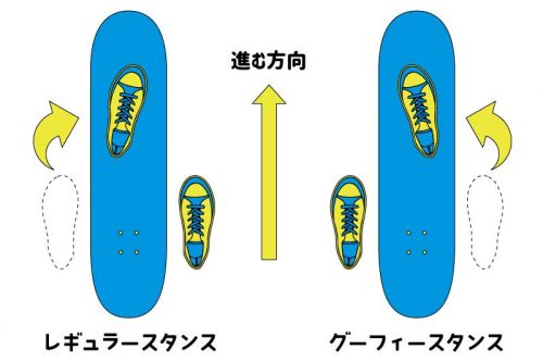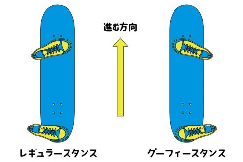 テールを踏んでデッキをコントロールすることが多いことと、地面を蹴って前に進む「プッシュ」では後ろ側の足を使うことが多いため、右足が利き足の場合レギュラースタンスになることが多いです。ですが、これに縛られることなく「自分が乗りやすいスタンス・しっくりくるスタンス」で何の問題もありません。